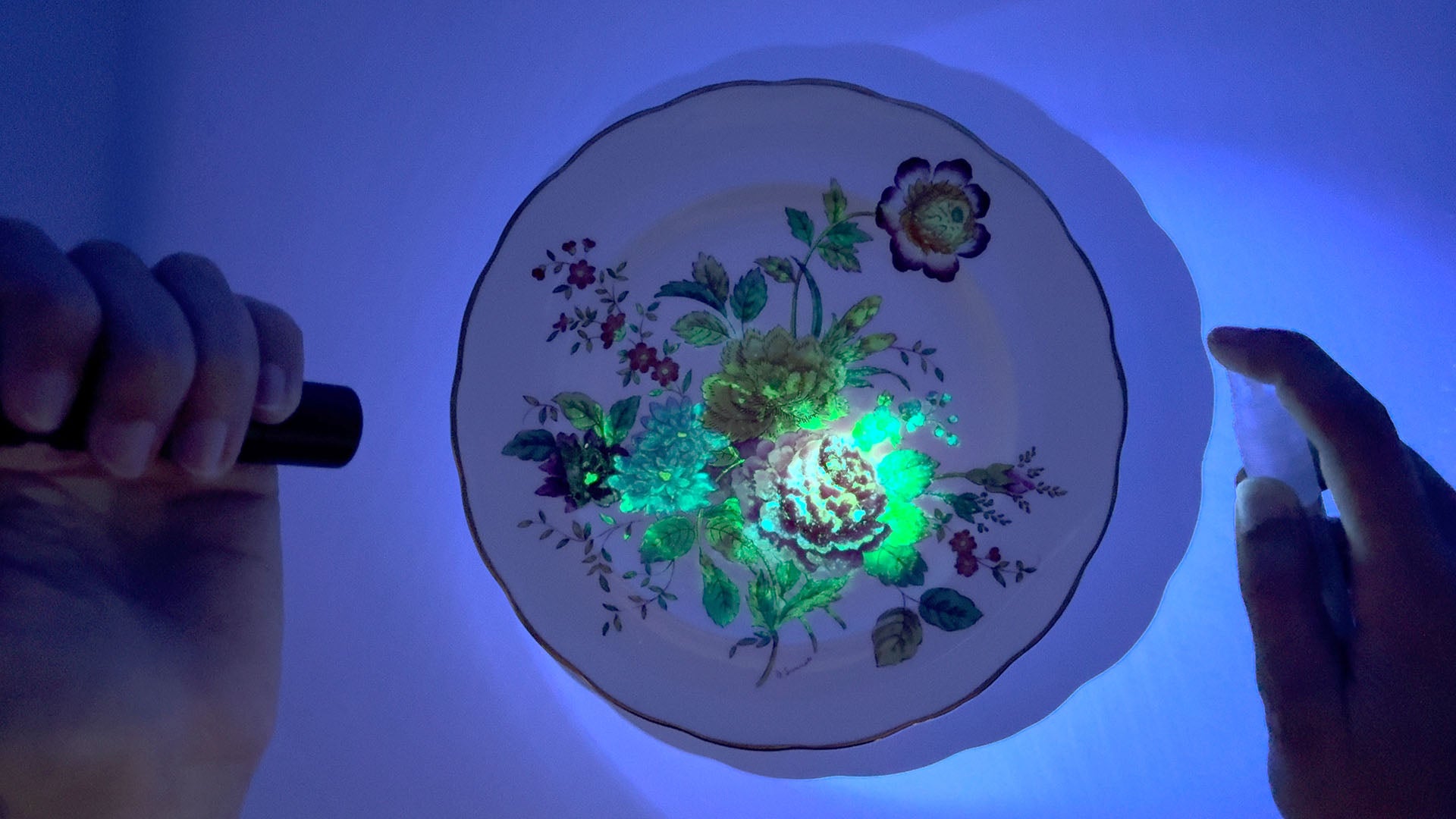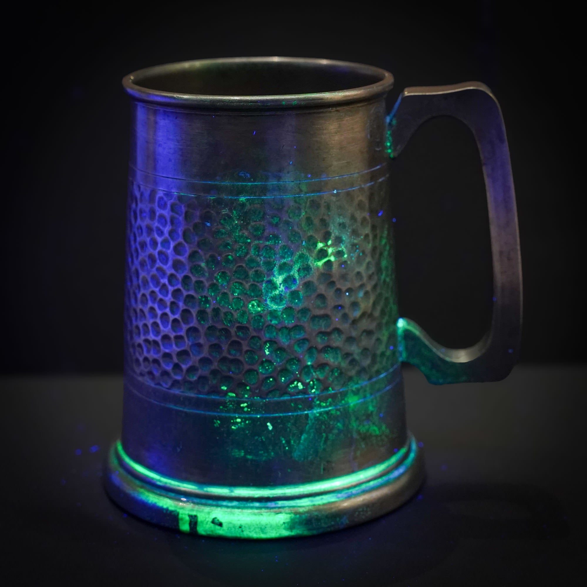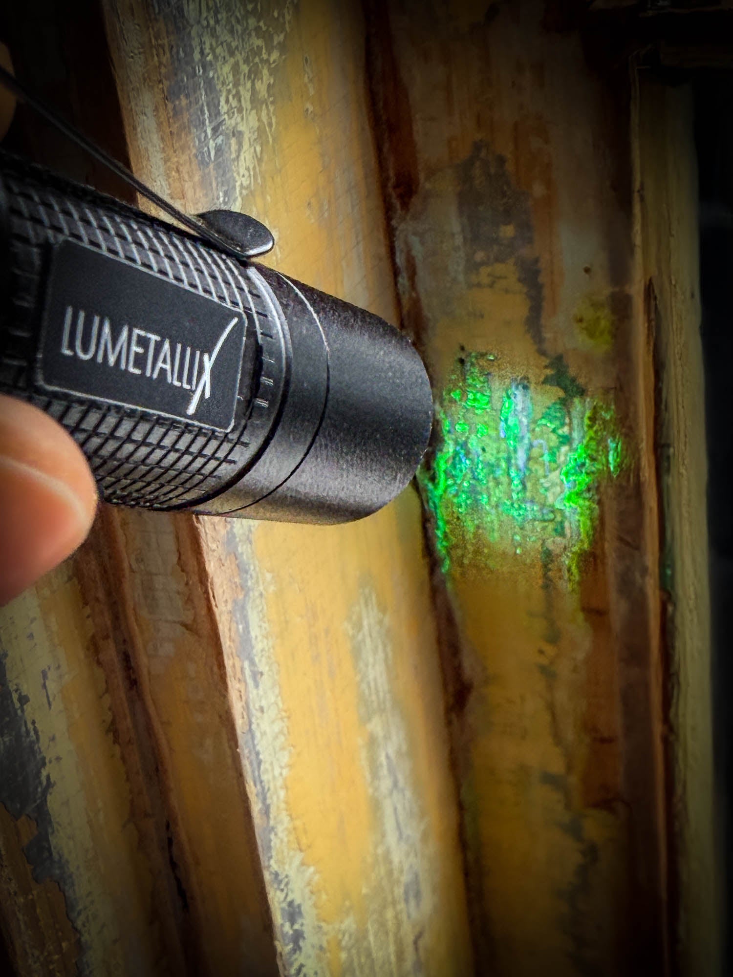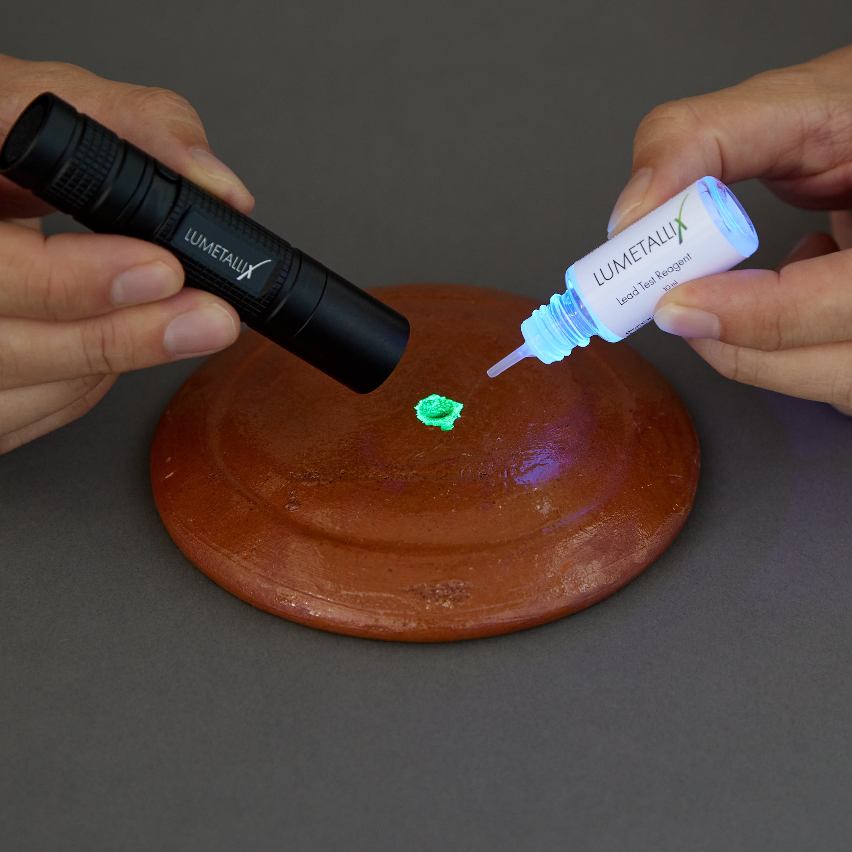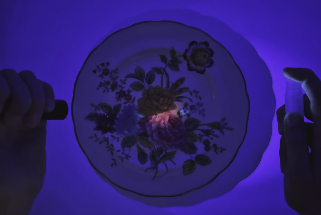 Shine the UV LeadLight on the surface you want to test. Spray or Drip the Reagent liquid onto the testing area. Watch for a Glowing Green Transformation.